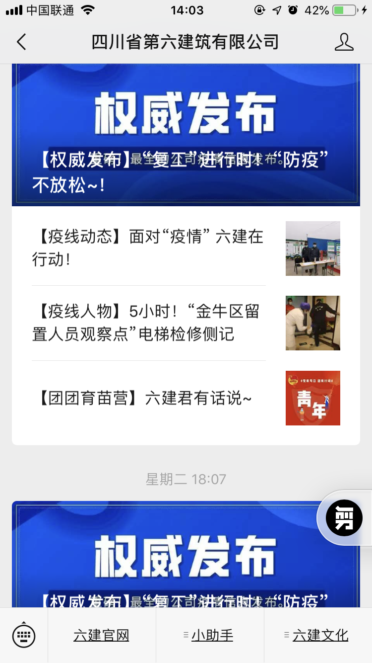 三是宣傳發(fā)動到位。公司黨委密切關(guān)注疫情動態(tài),積極做好輿論引導(dǎo)。善用微信公眾號正確發(fā)聲,把黨中央和國資委黨委、集團(tuán)黨委各項防控部署及時宣傳到位,教育引導(dǎo)黨員職工群眾不信謠不傳謠;主動發(fā)聲,發(fā)揮典型激勵作用,通過設(shè)置《戰(zhàn)疫一線》、《疫線人物》等專欄,勾畫出六建人奮戰(zhàn)一線的群體形象,有效鼓舞了戰(zhàn)“疫”士氣,努力凝聚起眾志成城、全力以赴、共克時艱的“善建精神”。