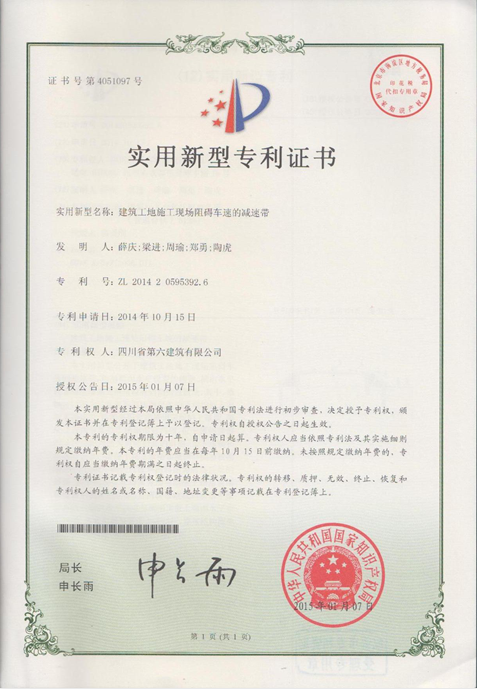 由八分公司“吉寶·沁風(fēng)御庭”項(xiàng)目部申請(qǐng)的“槽鋼減速帶”榮獲國(guó)家實(shí)用新型專利,該專利于2015年1月7日起生效。