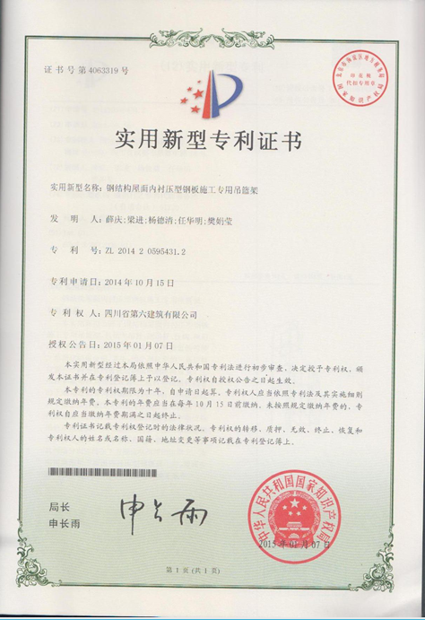由一分公司好圣2#鑄造車間項目部申請的“鋼結構屋面內(nèi)襯壓型鋼板施工專用吊籃架”榮獲國家實用新型專利,該專利于2015年1月7日起生效。